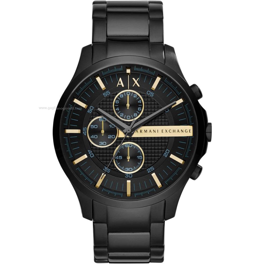 Armani Exchange men's watch, ax2164, hampton collection quartz movement, chronograph, 47mm black steel case, 12mm deep, black dial with gold indexes, black steel strap, 50m water resistance