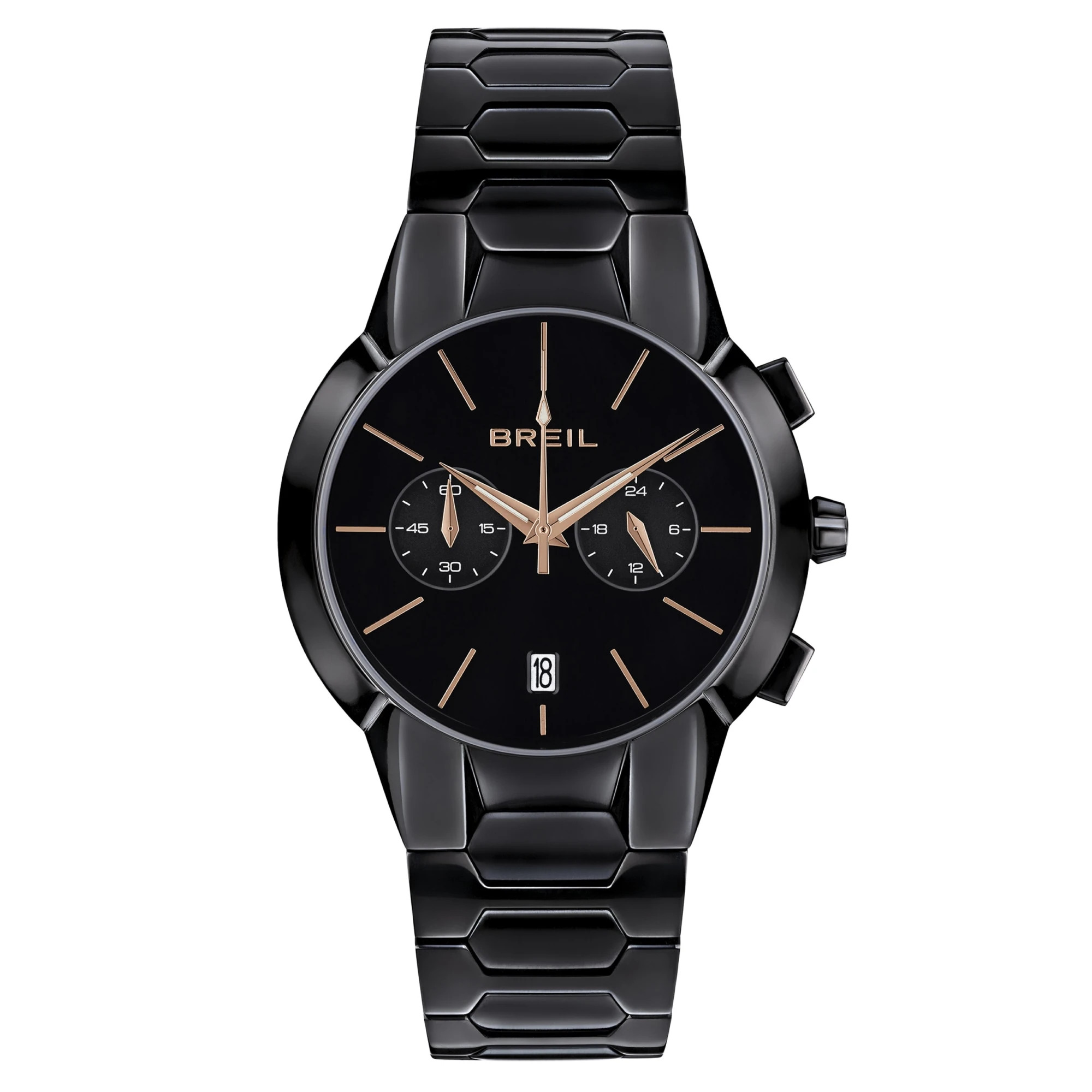 Il cronografo da uomo New One è caratterizzato da una linea morbida e avvolgente. Il bracciale ha una costruzione originale, esaltata dall'utilizzo dell'acciaio bilux, lucido e satinato. In questa versione è presentato in color black, ripreso sia nella cassa e nel bracciale integrati, sia nel quadrante con dettagli IP rose che ne esaltano la classe. Il contrasto tra linee e curve conferisce un design contemporaneo e metropolitano. Vetro antiriflesso.